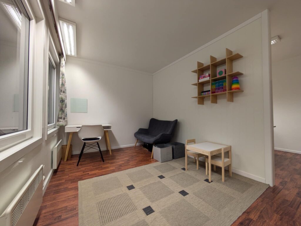 Vi har to modarne rom og et venterom med toalett. I et av rommene foregår individuell logopedi og samtaler med pasienter eller barns foreldre. I det andre rommet foregår gruppelogoterapi eller trening/opplæring for inntil 10 personer.